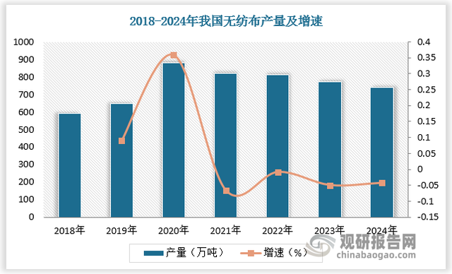 在2020年疫情期间,无纺布行业迎来了前所未有的发展机遇,产量达878.8万吨。然而,进入2021年,随着疫情的好转和市场的逐渐稳定,无纺布产量及企业利润总额出现了一定程度的回落。根据数据,2021年我国无纺布产量下降至820.5万吨,增速为-6.63%;2021年我国无纺布产量下降至813.5万吨,增速为-0.85%。2023、2024年我国无纺布产量将进一步下降至773万吨、740万吨,这反映了市场对于防疫物资需求的变化,也体现了无纺布产业自身的调整和适应能力。