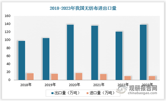 国内无纺布供给充足,同时,基于价格和品质优势,我国无纺布在出口市场表现出较强竞争力。根据数据,2023年,我国无纺布进口量减少至 10 万吨,而出口量则增长至 138万吨。