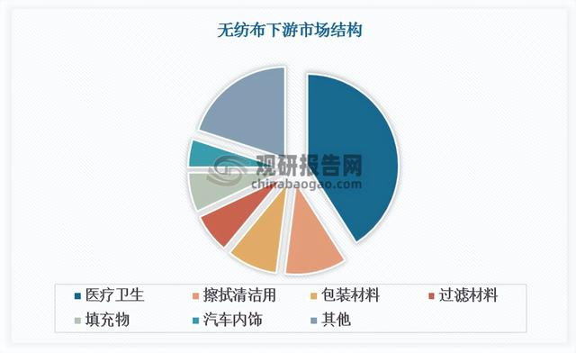无纺布主要应用于医疗卫生领域,占比达到 41%;其次是擦拭清洁用领域,占比为11%;再者是包装材料、过滤材料、填充物领域,占比分别为 9%、7%、7%;其他应用领域占比较小,均在5%及以下。